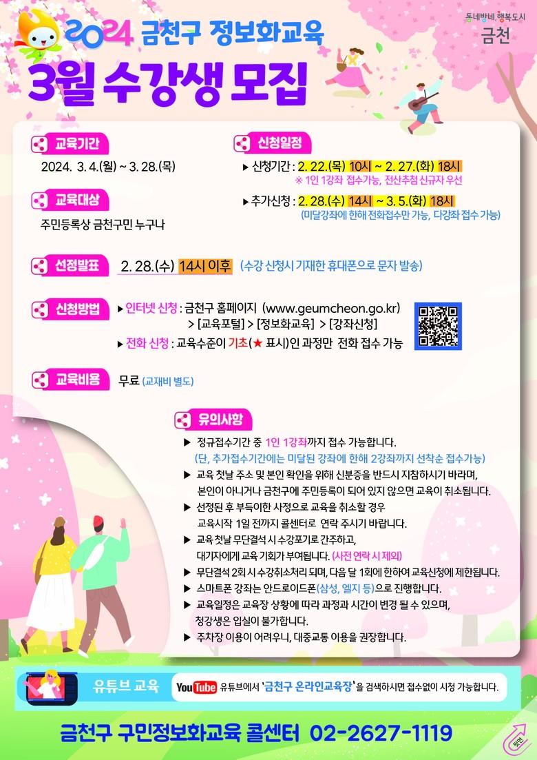 자세한 사항은 금천구청 소통담당관(☏02-2627-1090) 또는 금천구 정보화교육 콜센터(☏02-2627-1119)로 문의하면 안내받을 수 있다.
