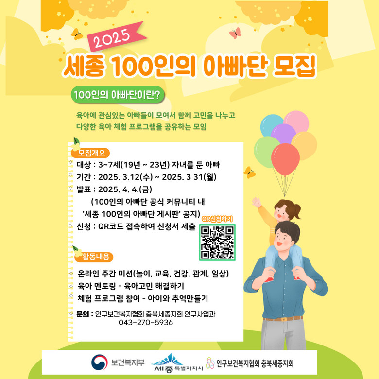 사업 참여는 세종시에 거주하는 3~7세(2019년~2023년 출생) 자녀를 둔 아빠라면 누구나 가능하고 네이버폼 바로가기 주소 (https://naver.me/FV7Ma1ta) 접속 후 신청서를 제출하면 된다.