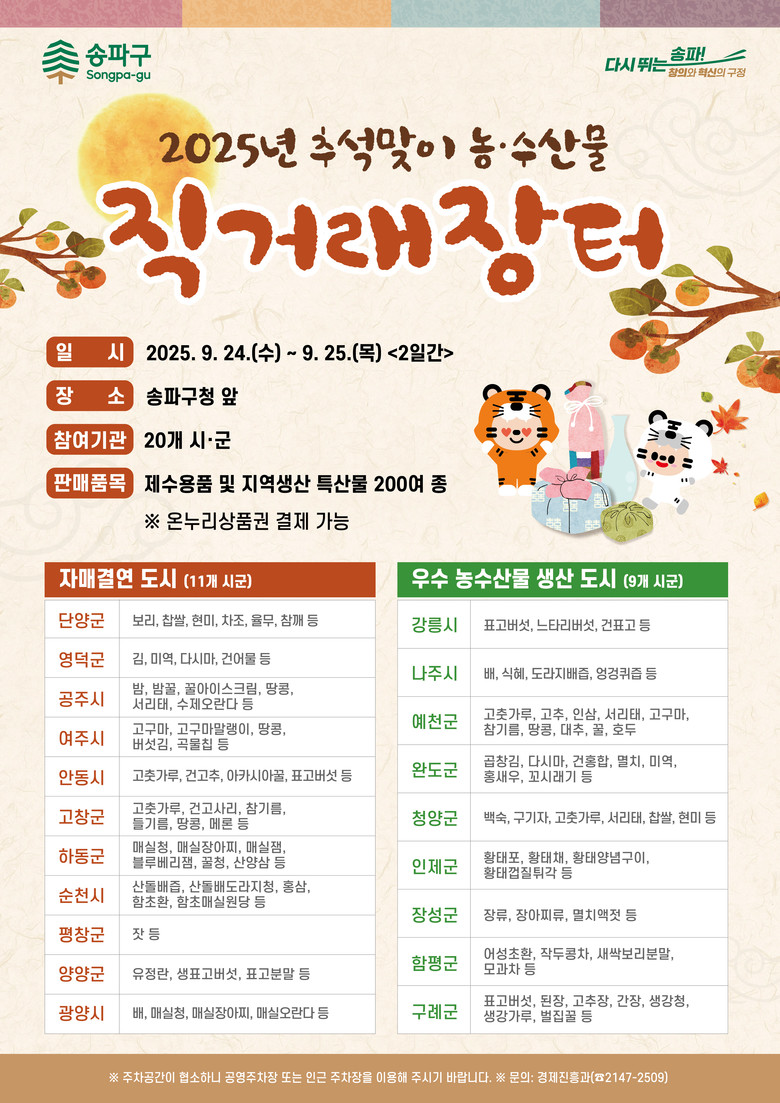 서강석 송파구청장은 “장바구니 물가가 걱정되는 주민들에게 조금이나마 보탬이 되길 바라는 마음으로 준비했다”라며 “직거래장터 장보기로 풍성한 명절을 준비하시길 바란다.”라고 말했다.