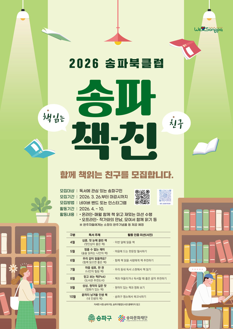 [송파구 세계타임즈=이장성 기자] 서울 송파구는 독서문화 확산을 위해 4월부터 10월까지 7개월간 ‘2026 송파북클럽-송파 책-친’을 운영한다.
