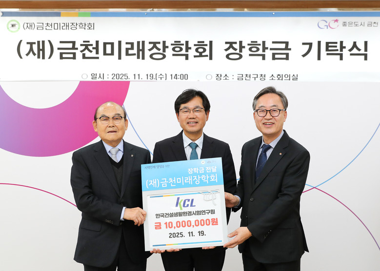지난 19일에는 KCL(한국건설생활환경시험연구원, 원장 천영길)이 금천미래장학회에 장학금 1,000만 원을 기탁했다.