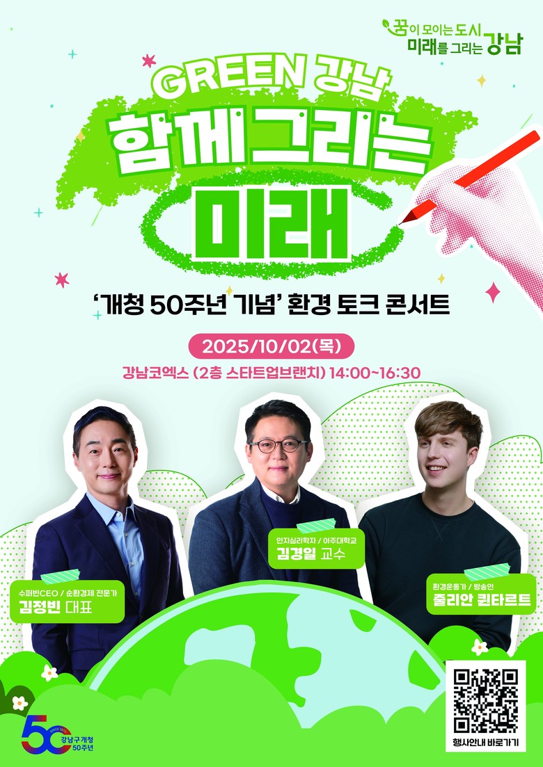 조성명 강남구청장은 “이번 환경 토크 콘서트는 강남 50년의 성장을 돌아보는 동시에, 미래세대를 위한 지속가능한 도시 전략을 함께 고민하는 자리”라며 “앞으로도 주민, 기업, 전문가가 함께하는 협력 모델을 통해 탄소중립 도시 강남을 실현하고, 기후위기 대응을 선도하는 글로벌 도시로 나아가겠다”고 밝혔다.