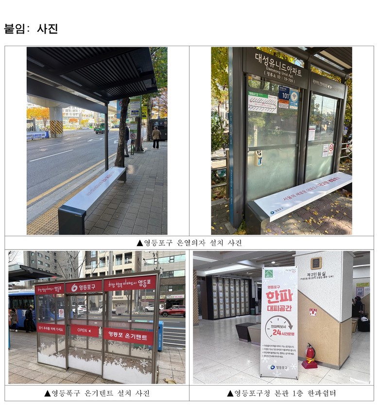 구는 한파 특보 발령 시 즉시 대응 가능한 체계를 마련하고 ‘한파 종합지원 상황실’을 운영해 현장 상황을 지속적으로 모니터링한다. 특히 버스정류장 등 유동 인구가 많은 곳에 온열의자 67개소를 추가 설치하고, 영등포구청 본관 1층을 한파쉼터로 신규 지정해 구민 불편을 최소화했다.