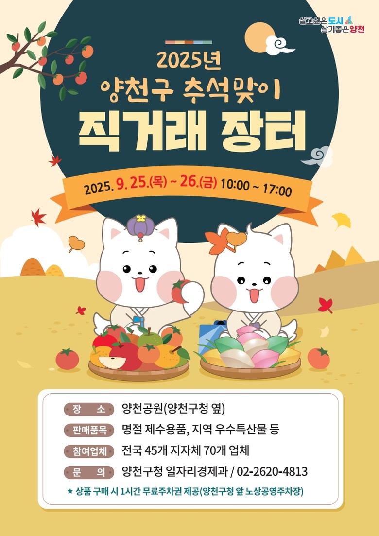 - 전국 45개 지자체 70개 우수업체 참여… 올해 17개 신규 업체 참여로 더 다양한 특산물 선보여 [양천구 세계타임즈=이장성 기자] 양천구(구청장 이기재)는 민족 최대 명절인 추석을 앞두고, 오는 9월 25일과 26일 양일간 양천공원에서 ‘2025년 추석맞이 직거래 장터’를 운영한다고 밝혔다.