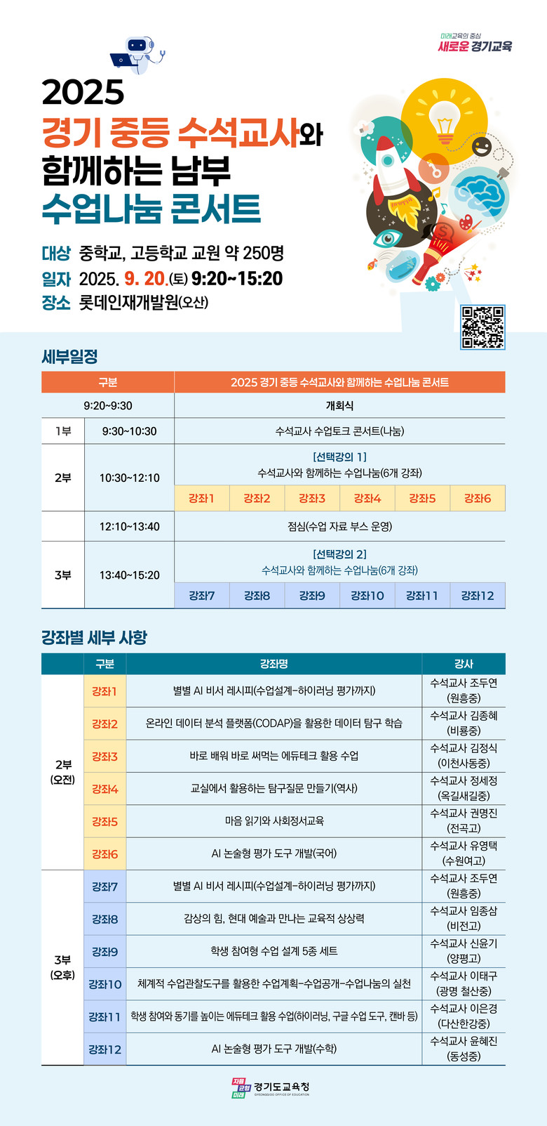 진행은 경기 수석교사 연구회가 중심이 되어 총 12개 강좌를 1, 2부로 구분해 이뤄진다. 특히 도내 수석교사들이 직접 개발하고 적용한 에듀테크 및 인공지능(AI) 활용 수업사례를 중심으로 강좌를 마련했다. 이에 따라 참여한 교사들이 희망하는 강좌를 선택해 배우고, 이를 수업에 바로 적용할 아이디어를 얻을 수 있도록 구성했다.