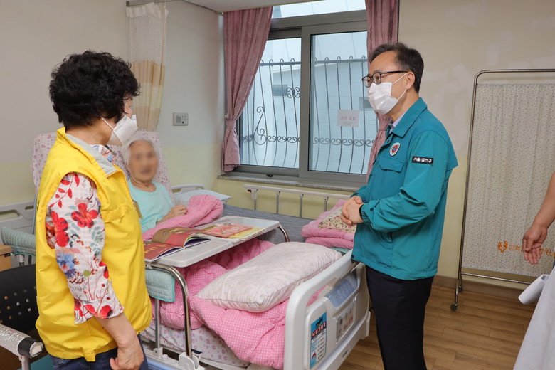 | ▲ 유성훈 금천구청장이 지난 5월 22일 금천구에 위치한 사랑채요양원을 방문해 현장시설을 점검하고 관계자와 요양기관 관련 종사자와 이야기를 나누고 있다 |