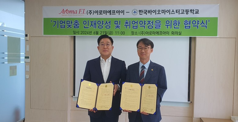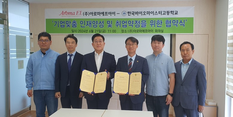 [충북 세계타임즈=이현진 기자] 한국바이오마이스터고등학교(교장 한석일)는 21일(금), ㈜아로마에프아이(대표이사 박형권) 음성공장에서 인재 육성 및 취업약정을 위한 산학협력을 체결하였다.