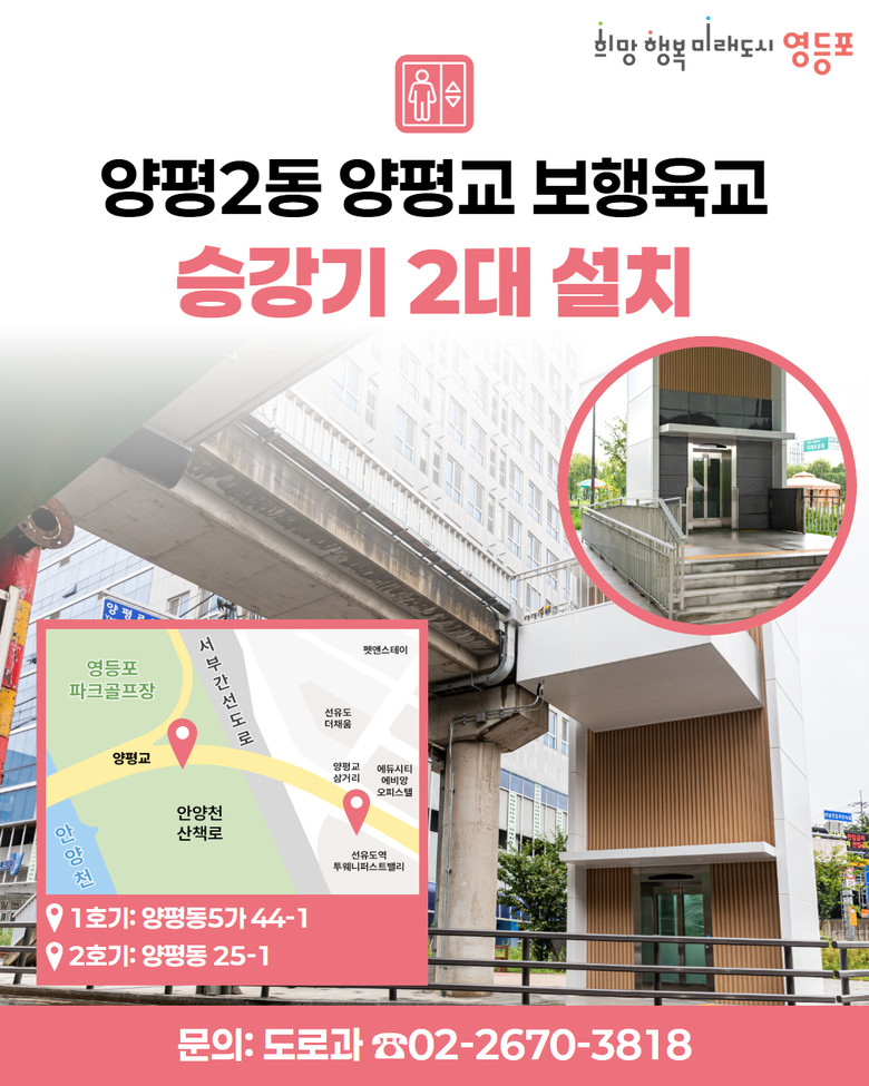 이러한 불편을 해소하기 위해 구는 서울시 예산 9억 원을 확보하고 구 예산 2억 원을 투입해 양평교에 승강기 2대를 신규 설치하고 운행을 시작했다.