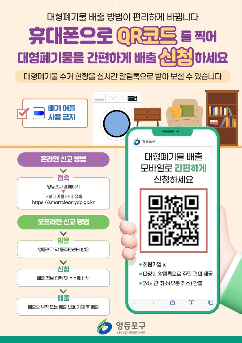 아울러 구는 대형폐기물 배출 ‘온라인 신청 창구’를 구청 누리집으로 일원화하고, 기존 민간 플랫폼 ‘빼기’ 운영은 중단한다. 이를 통해 개인용 컴퓨터(PC)와 모바일 어디서나 휴대폰 인증만으로 간편하게 신청할 수 있으며, 취소와 환불 역시 누리집에서 24시간 처리할 수 있어 주민 편의가 크게 향상될 전망이다. 다만 온라인 신청이 어려운 주민은 기존과 동일하게 주민센터를 방문해 신청할 수 있다.