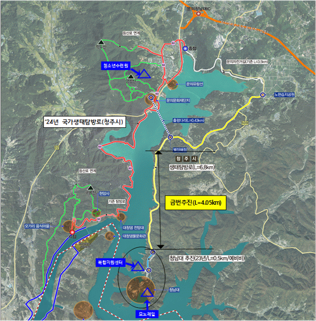 한편, 청남대 생태탐방로 조성공사는 2023년 10월 충북도와 청주시, 충북개발공사가 업무협약을 체결하고 추진한 사업으로, 도 기금(84억원)으로 2024년 11월부터 2025년 4월까지 충북개발공사에서 시행하였으며, 사후관리는 청주시에서 추진할 예정이다.