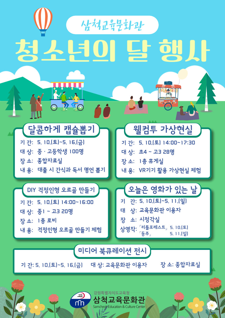 관련 자세한 내용은 삼척교육문화관 종합자료실(☎ 570-5530)로 문의하면 된다.