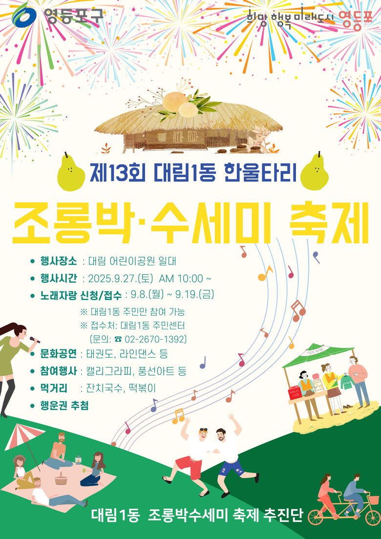 대림 어린이공원에서는 오전 10시부터 ‘제13회 조롱박‧수세미’ 축제가 열린다. 2011년 시작해 매년 이어온 이 축제는 덩굴식물인 조롱박과 수세미처럼 주민들도 세대와 계층을 넘어 조화를 이루며 함께 즐기고자 하는 의미를 담고 있다.