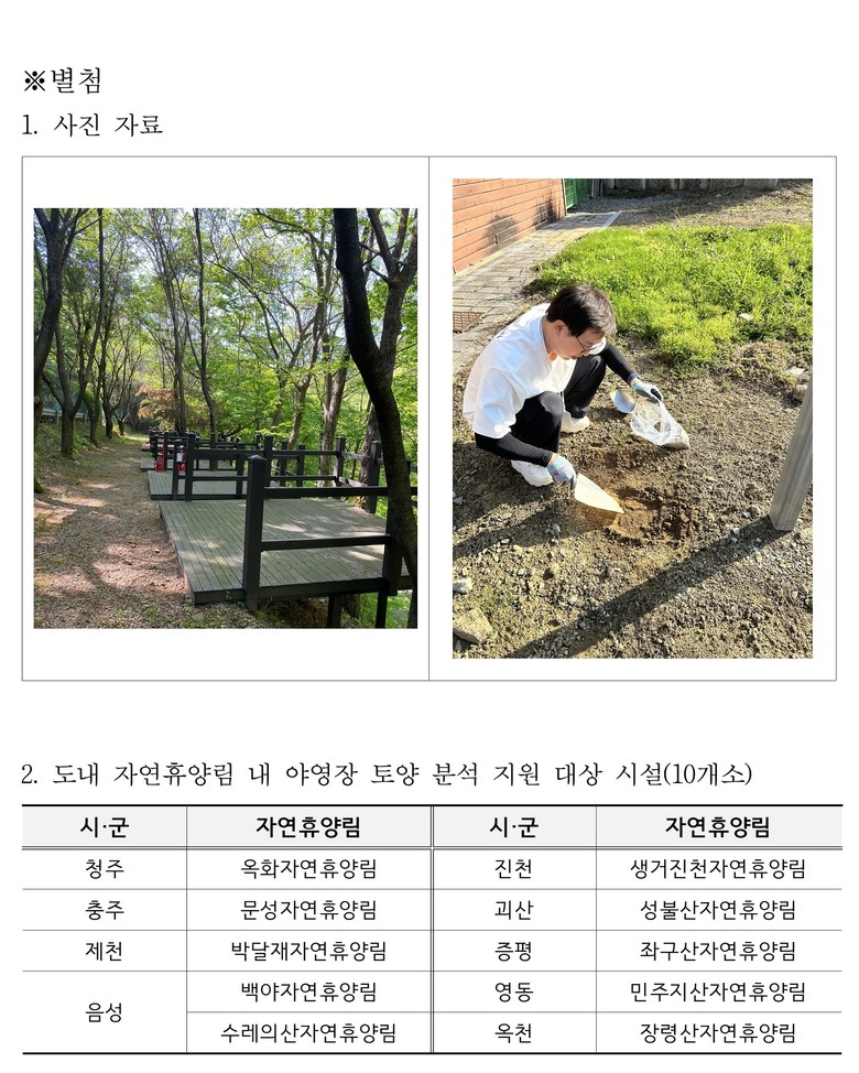 충북도내 자연휴양림 야영장 토양 오염 조사 ‘안전’