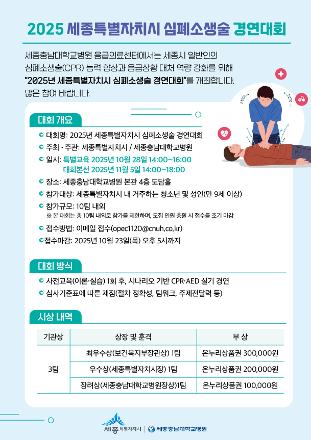 대회 관련 자세한 문의는 시 감염병관리과(☎044-300-6833) 또는 세종충남대학교병원 응급의료센터 사업팀(☎044-995-3020)으로 하면 된다.