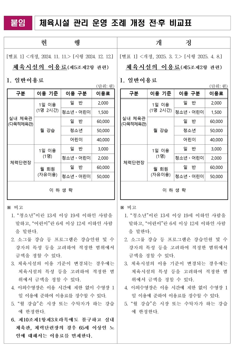 이에 따라 오는 4월 8일부터는 65세 이상 시민도 실내체육관 일일 입장료 1,000원, 체력단련장 일일 입장료 1,500원, 월 정기이용 시 3만 원을 납부해야 한다.