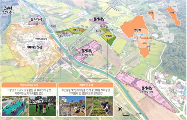 사업에 선정된 증평군은 사업비 180억 원(국비 90억 원)을 투입해 연탄1리 일원에 유해시설인 축사 등을 철거 및 정비하고, 정비부지에 재생 사업으로 건강누리마당 및 여울마당 조성, 토지정화를 통해 마을환경과 주거환경을 개선할 계획이다.