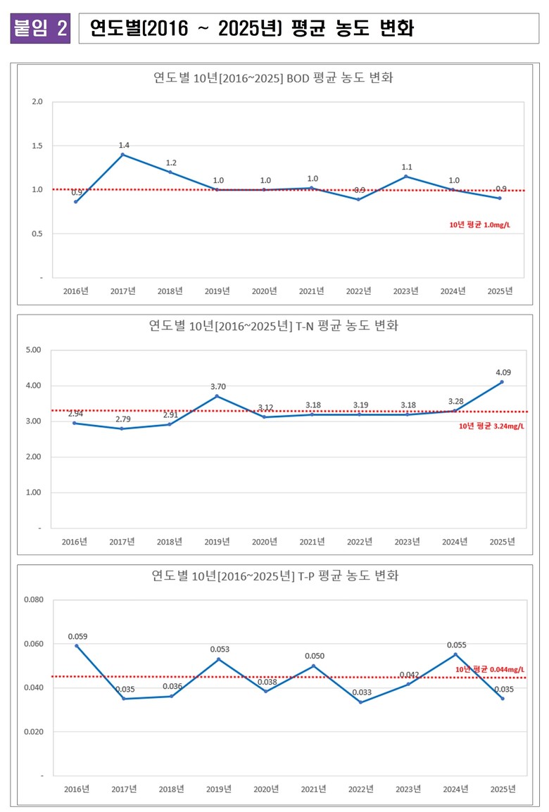 이는 하천 목표 수질 항목인 생물화학적산소요구량을 기준으로 평가 시 우리나라 환경정책기본법 하천 생활환경기준 Ⅰ등급에 해당하는 수치이며, 지난 10년 평균 농도와 비교했을 때 큰 차이 없이 ‘좋음’ 상태의 수질을 유지하고 있는 것으로 나타났다.