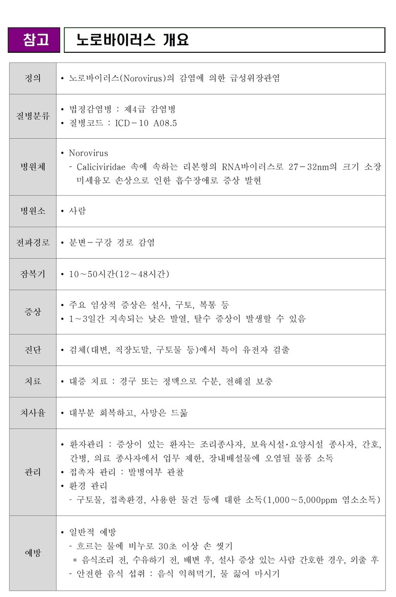 윤건묵 보건연구부장은 “노로바이러스는 적은 양으로도 사람 간에 감염이 되기 때문에 음식 섭취뿐만 아니라 감염 환자와의 접촉을 피하고, 손 씻기 등 개인위생 관리에 철저를 기해야 한다.”며, “면역력을 유지하는 기간도 짧아 과거에 걸렸던 사람도 재감염이 가능하므로 개인·식품 위생관리에 각별한 주의가 필요하다.”고 말했다.