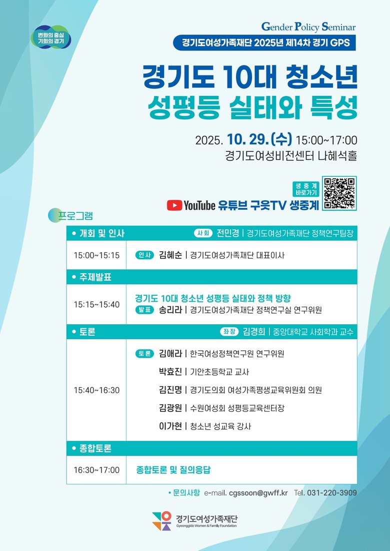 유튜브 생중계로 개최하는 토론회는 재단이 수행 중인 「경기도 10대 청소년 성평등 실태조사」 연구결과를 공유하고 향후 정책방향을 논의하기 위해 마련됐다.