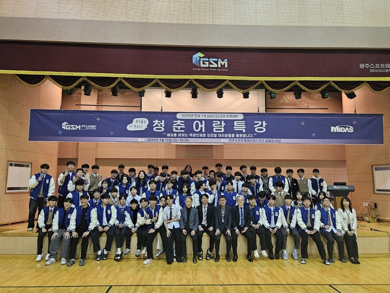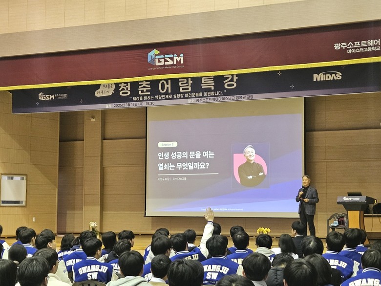 [광주 세계타임즈=손권일 기자] 광주소프트웨어마이스터고등학교(이하 광주소마고)가 지난 13일 본교 강당에서 마이다스 그룹 이형우 회장을 초청해 전교생 및 교직원을 대상으로 특별 강연을 실시했다.