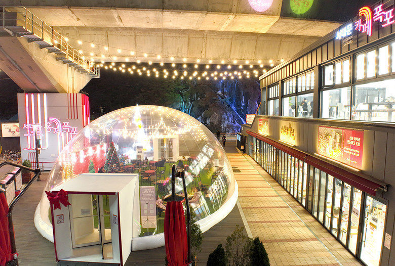 | ▲ 겨울철 ‘초대형 반구형 투명 에어돔’이 설치된 서대문구 카페폭포 |