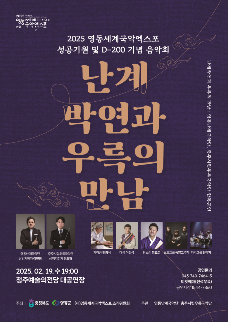 엑스포가 200여 일 앞으로 다가온 가운데 조직위는 오는 2월 19일 오후 7시 청주예술의전당에서 「난계 박연과 우륵의 만남」이라는 주제로 영동난계국악단과 충주시립우륵국악단의 합동공연을 개최한다고 밝혔다.
