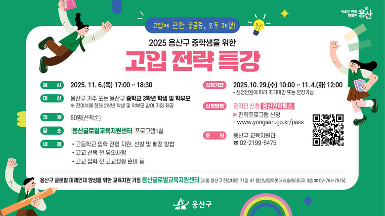 ‘중학생을 위한 고입 전략 특강’은 11월 6일 오후 5시 용산글로벌교육지원센터(한강대로71길 47, 3층)에서 열린다. 참가 대상은 용산구에 거주하거나 지역 내 학교에 재학 중인 중학교 3학년 학생과 학부모 50명이다.