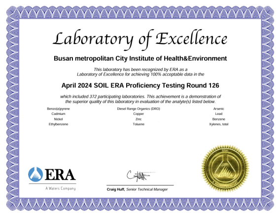 2024년 80여 개국이 참여한 국제숙련도 평가 중 ▲먹는 물 분야 17개 항목 ▲수질 분야 21개 항목 ▲토양 분야 12개 항목 ▲환경 유해인자(모래) 분야 3개 항목 등 평가받은 전 항목에서 최고 등급인 ‘만족(Satisfactory)’을 받았다.