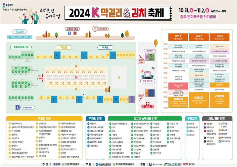 2024년 대한민국 막걸리 & 김치 축제는 충청북도기업진흥원과 (사)한국막걸리협회에서 공동으로 주관하며, 전국 대표 100개 이상의 지역 특산 막걸리와 충북 대표 브랜드 어쩌다 못난이 김치 및 지역별 농특산물을 한 곳에서 만날 수 있는 흔치 않은 기회이다.