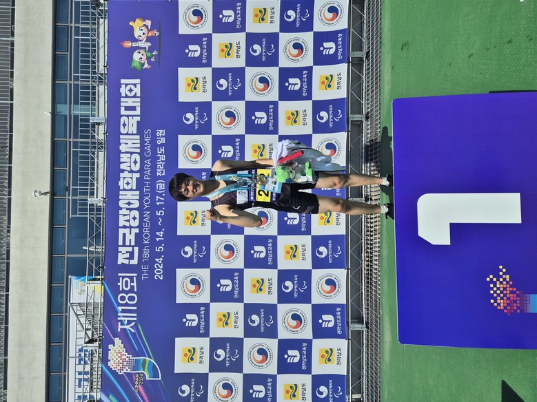 | ▲ 논산중학교 2학년 오환빈 학생이 14~17일 전라남도 목포에서 개최된 제18회 전국장애학생체육대회에서 충청남도 대표로 출전하여 육상 트랙 멀리뛰기 금메달, 100m에서 동메달을 획득했다. |