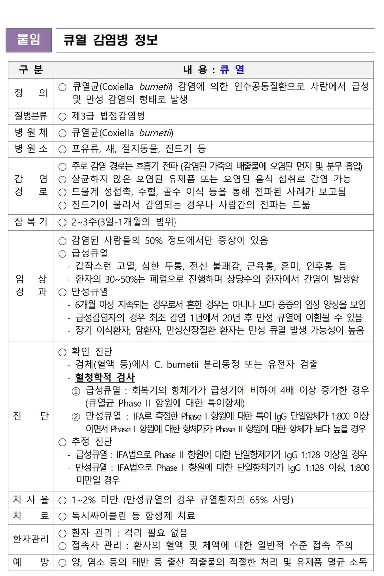 큐열은 소, 염소, 양 등 감염된 가축의 배설물, 부산물, 유즙 등을 통해 사람에게 전파되는 제3급 법정감염병으로, 주로 비말에 의한 호흡기 감염이나 생고기, 살균되지 않은 우유 섭취를 통해 감염된다. 감염력이 높아 단일 균체만으로도 감염될 수 있다.