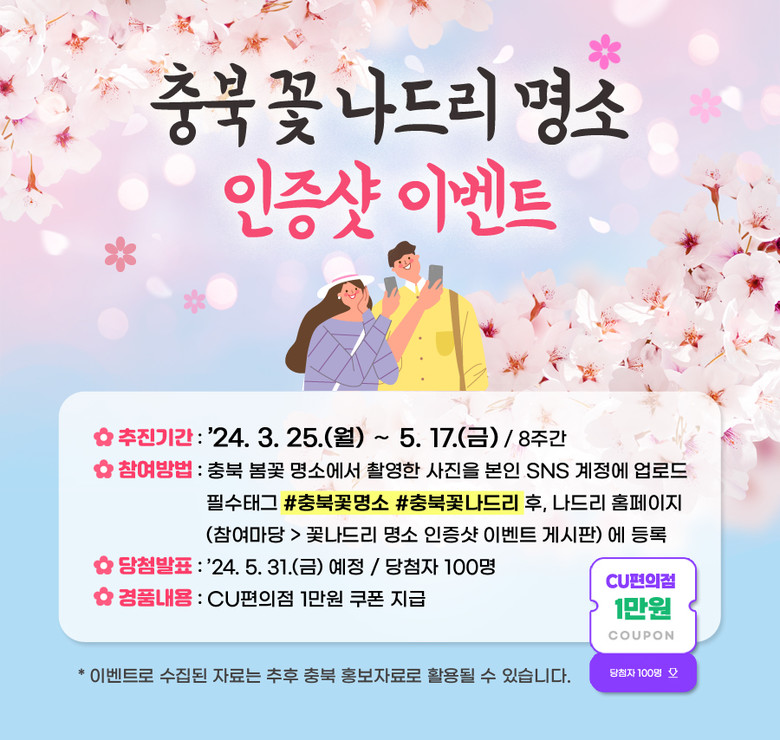 참가자는 충복 봄꽃 명소에 방문해 촬영한 사진을 본인의 SNS 계정에 필수 태그(#충북꽃명소 #충북꽃나드리)를 포함해 업로드 후, 나드리 홈페이지에 인증 내용을 등록하면 되고, 당첨자는 5월 31일에 발표될 예정이며, 총 100명에게는 CU편의점 모바일상품권(1만원 상당)이 지급된다.