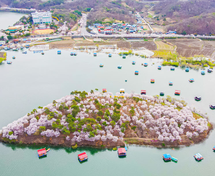 진천 벚꽃섬은 섬 전체가 벚꽃으로 뒤덮여 있는 곳으로 꽃이 만발한 섬에서의 피크닉은 봄의 정취를 만끽하기에 충분하며 주변에는 아름다운 호수도 있어서 경치가 뛰어나다.