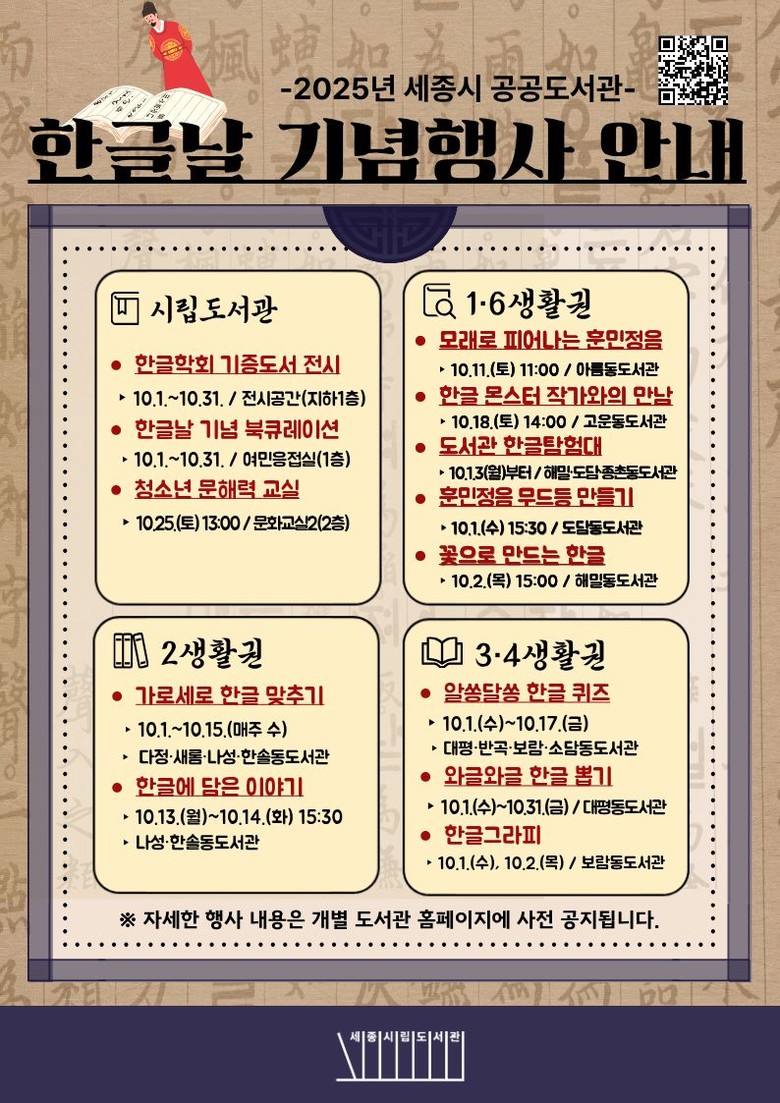 시립도서관에서는 ▲한글학회 기증도서 전시 ▲한글날 기념 책추천(북큐레이션) ▲청소년 문해력 교실이 진행된다.