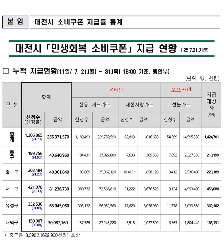 대전시의 민생회복 소비쿠폰 1차 지급률은 91.7%다. 행정안전부 집계(7월31일 18시 기준) 결과, 지급 대상자 142만 4,000여 명 가운데, 130만 7,000여 명에게 지급된 것으로 확인됐다.