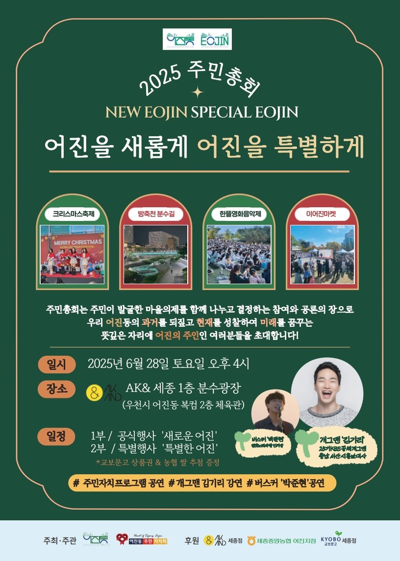 정성헌 주민자치회장은 “마을의 일을 주민 스스로 결정하는 이번 주민총회가 어진동 공동체의 자긍심을 높이는 계기가 되기를 바란다”며 “앞으로도 주민 목소리를 바탕으로 실질적인 자치를 실현해 나가겠다”고 전했다.