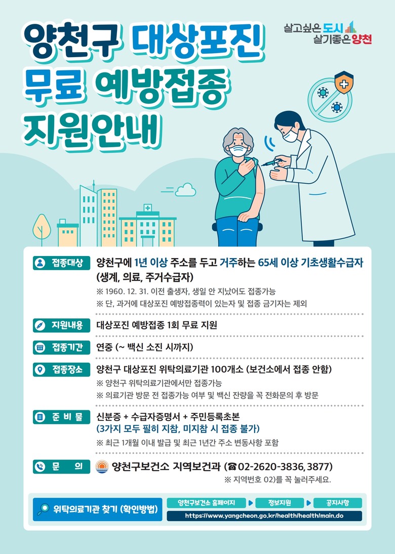 이기재 양천구청장은 “고령층의 건강과 일상생활을 위협하는 질환을 사전에 예방하기 위해 어르신들이 경제적 부담 없이 예방접종을 받으실 수 있도록 제도적 기반을 마련하고 적극 지원하고 있다.”며, “앞으로도 활기찬 노후 생활을 이어갈 수 있도록 최선을 다하겠다.”고 말했다.