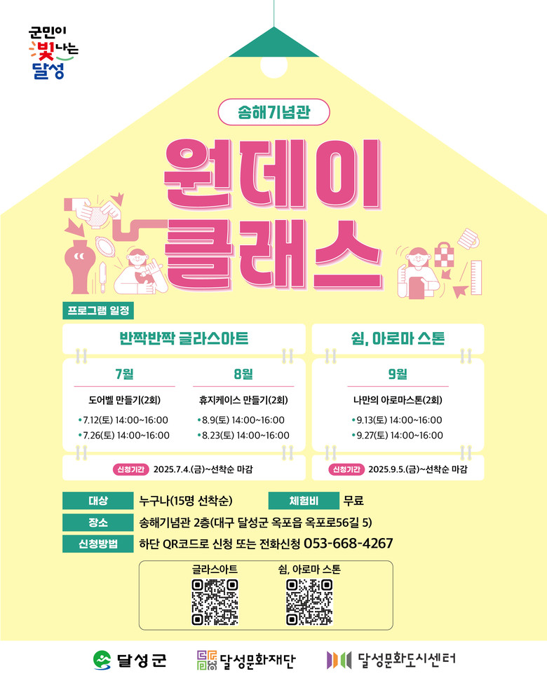 이외에도 특별 프로그램인 ‘원데이 클래스’가 여름철 문화 체험 기회를 더한다. 7~8월에는 유리공예 체험 ‘반짝반짝 글라스아트’(4회), 9월에는 아로마 테라피 체험 ‘쉼, 아로마스톤’(2회)이 운영되며, 각 회차당 선착순 15명을 대상으로 한다. 참여 신청은 포스터 내 QR코드 또는 전화(☎053-668-4267)를 통해 가능하다.