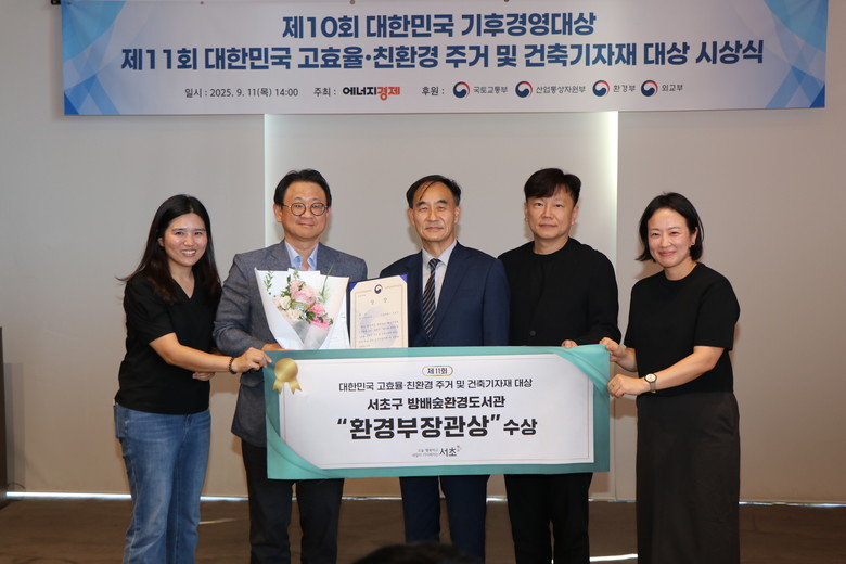 [서초구 세계타임즈=이장성 기자] 서울 서초구(구청장 전성수)가 11일 에너지경제신문이 주관한 ‘제11회 대한민국 고효율·친환경 주거 및 건축기자재 대상’에서 서초구립 방배숲환경도서관이 환경부장관상을 수상했다고 밝혔다.