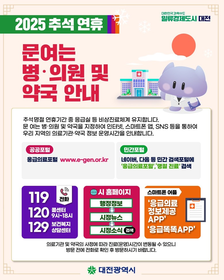 연휴 기간 운영되는 의료기관과 약국 현황은 대전시와 자치구 홈페이지, 응급의료포털, ‘응급의료정보제공’ 및 ‘응급똑똑’ 애플리케이션, 대전시 120콜센터, 129 보건복지상담센터 등을 통해 확인할 수 있다.