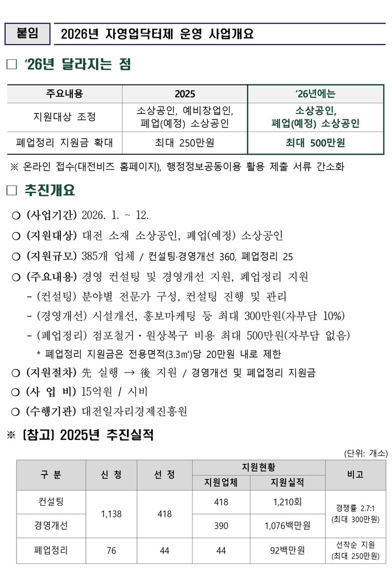 - 대전시 자영업닥터제 운영… 폐업정리 지원금 상향, 신청서류 간소화 -