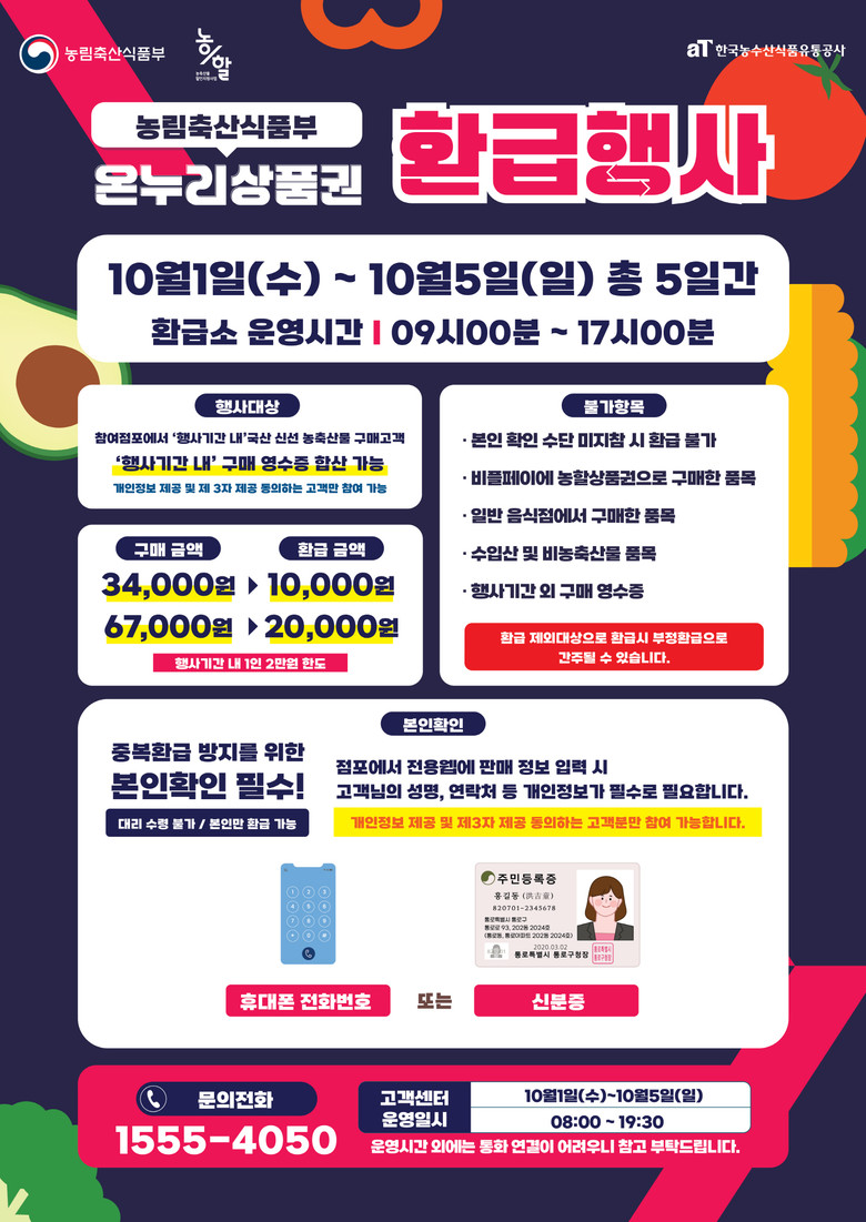행사 기간 중 참여 점포에서 국산 신선 농축산물 또는 수산물을 구매한 소비자는 구매 금액의 최대 30%를 온누리상품권으로 환급받을 수 있다. 품목별(농축산물, 수산물)로 1인당 각각 2만 원까지 환급이 가능해, 두 부문을 모두 이용하면 최대 4만 원의 혜택을 받을 수 있다. 환급 금액은 ▲3만 4천 원 이상~6만 7천 원 미만 구매 시 1만 원, ▲6만 7천 원 이상 구매 시 2만 원이다.