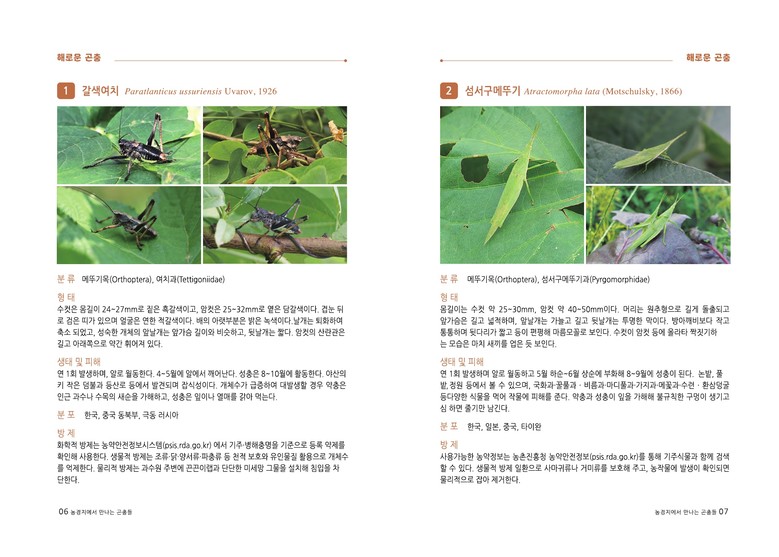 1장에서는 농작물 피해와 직접적으로 연관된 해로운 곤충 51종을 다뤘다. 종별 형태와 생태, 피해 양상, 분포 지역, 방제 방법을 정리해 해충 발생 시 대응 기준을 제시한다.