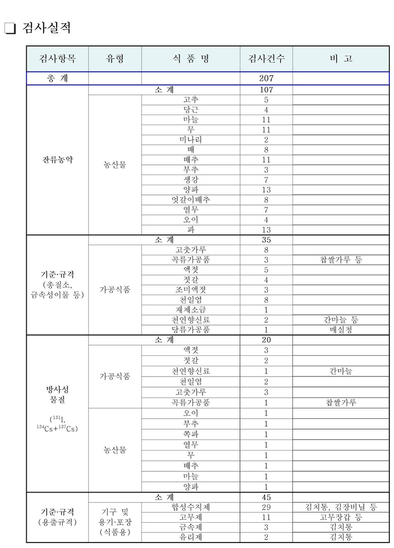 품목별 잔류농약, 총질소, 이물, 방사성물질, 용출규격을 검사한 결과 모두 기준과 규격에 적합했다.