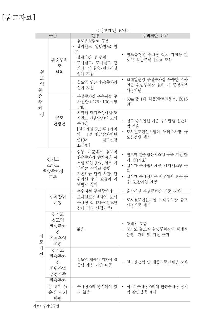 마지막으로는 제도 정비와 개선을 꼽았다. 오래돼 현실과 거리가 있는 철도역 환승주차장 설치 기준을 새롭게 정비할 필요가 있다. 철도역과 같은 운수시설 부설주차장 설치기준도 강화해야 한다. 특히 경기도는 철도역 환승주차장 연계 운영 지침 수립이 요구된다. 환승주차장은 철도 이용을 전제로 설계되고 운영되어야 하며, 철도역과 환승주차장의 연계 시스템 이용과 요금 감면으로 이용자에게 실질적인 혜택 제공을 목적으로 한다.