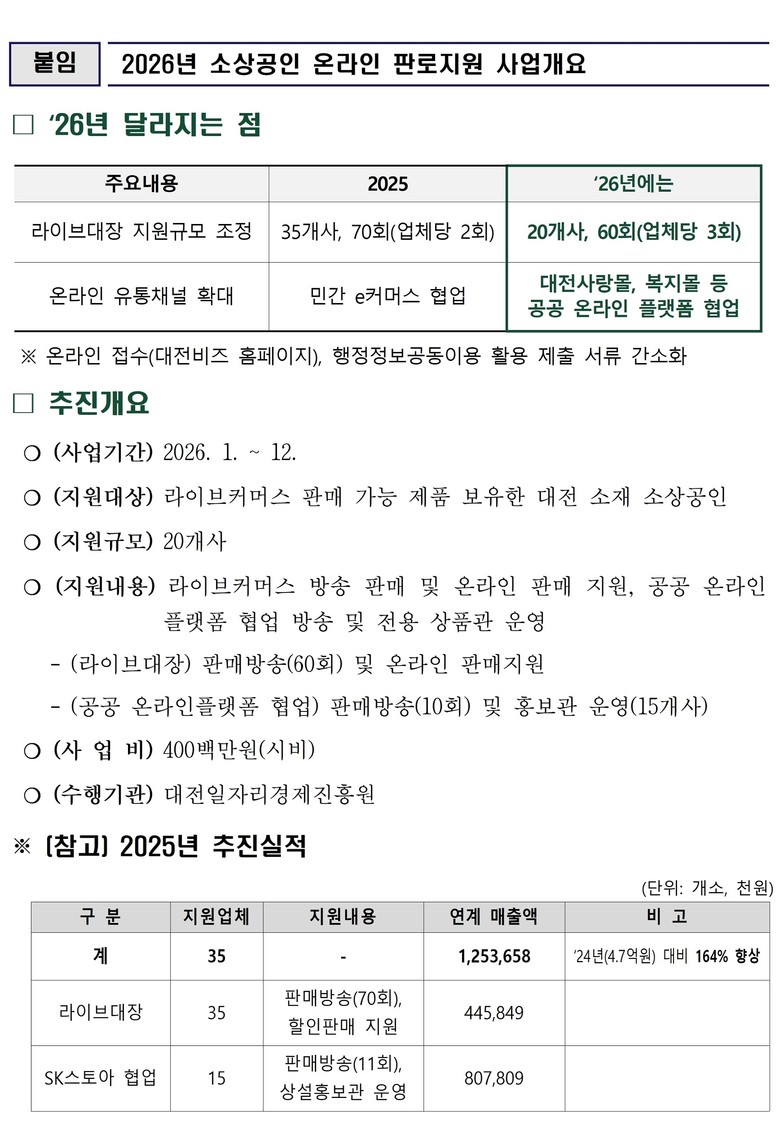 또한, 대전사랑몰과 복지몰 등 공공 온라인플랫폼과 협업한 판매방송과 함께 온라인 상설 홍보관 입점 기회도 추가로 제공된다.