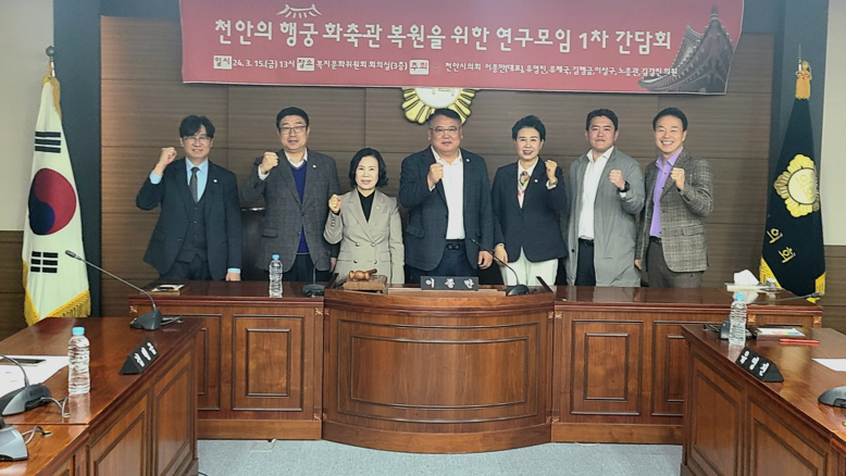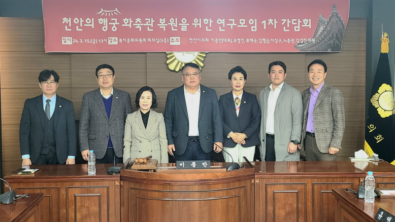 [천안시 세계타임즈=백택기 기자] 천안시의회는 15일 복지문화위원회 회의실에서 「천안의 행궁 화축관 복원을 위한 연구모임 (이종만(대표), 유영진, 류제국, 이상구, 김행금, 노종관, 김강진 의원)」을 개최하고, 천안의 행궁 화축관 복원을 통해 문화유산의 가치를 높일 수 있는 방안을 마련하기 위한 1차 간담회를 가졌다.