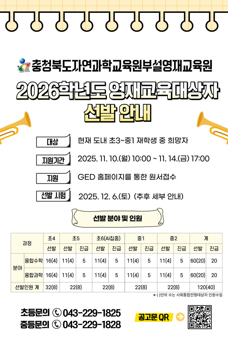 [충북 세계타임즈=이현진 기자] 충청북도교육청 직속기관 자연과학교육원(원장 지성훈)은 2026학년도 자연과학교육원부설영재교육원 영재교육대상자 선발을 실시한다고 밝혔다.