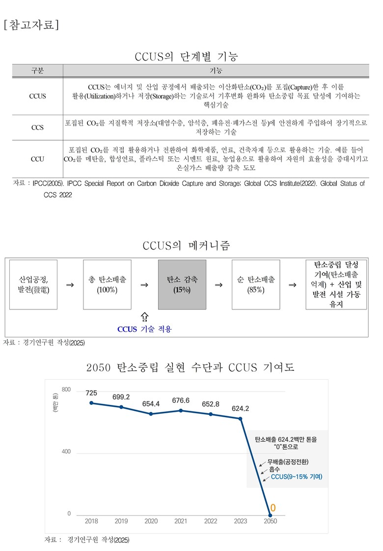 경기연구원은 CCUS를 탄소중립 달성의 과도기적 혁신기술이자 기후테크 신산업 육성의 출발점으로 평가했다.