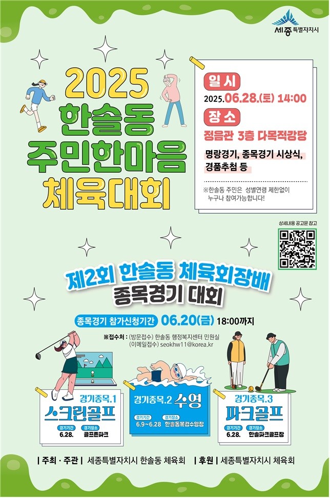 정은주 한솔동체육회장은 “한솔동 주민한마음 체육대회가 이웃 간 소통과 화합의 계기로 자리잡아 무더운 여름날 즐거움과 활력을 얻을 수 있는 시간이 되길 바란다”며 “주민 여러분의 많은 관심과 적극적인 참여를 부탁 드린다”고 말했다.